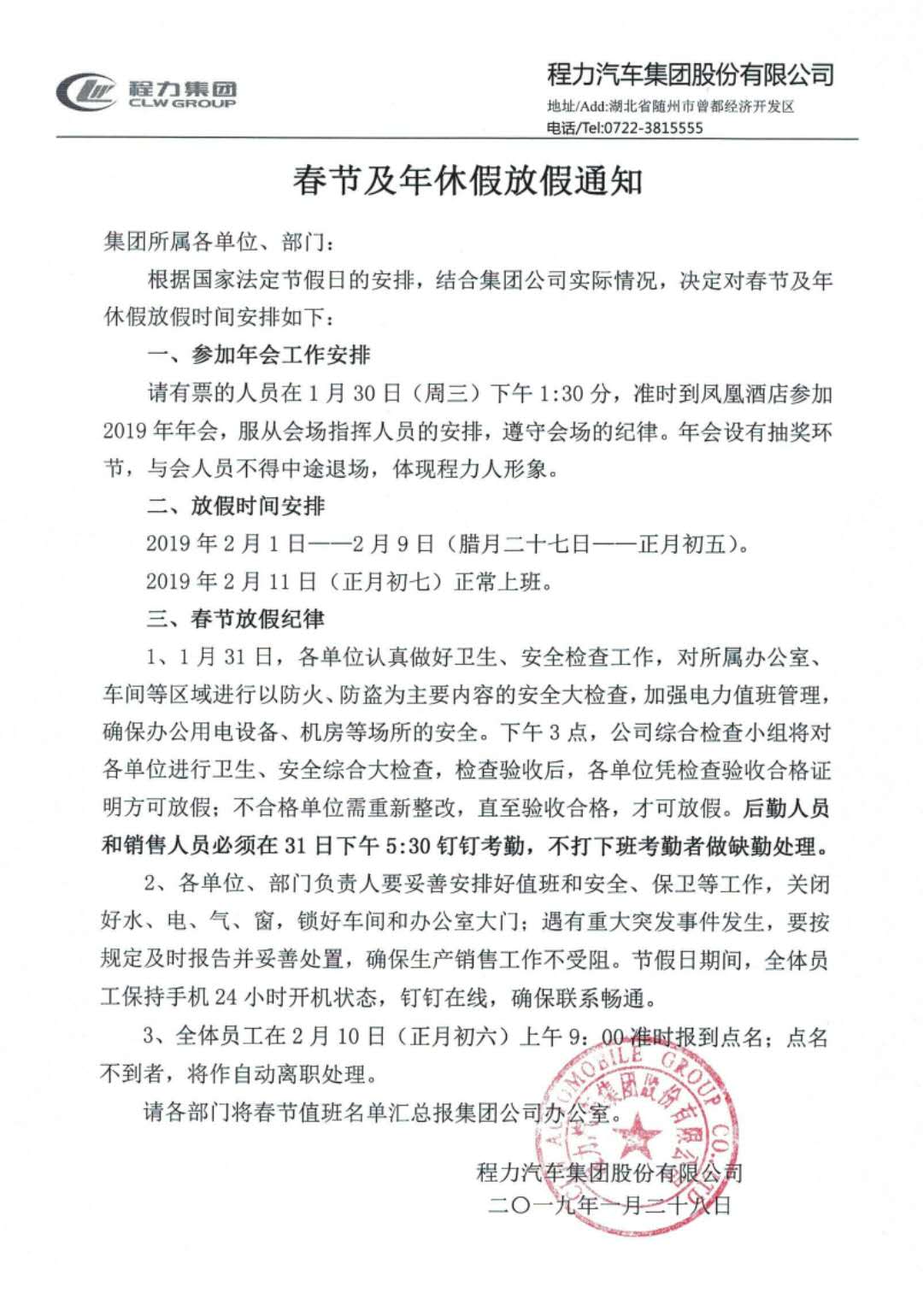 湖北程力集團經公司各部門商議決定,2019年春節假期從2019年2月1號(農歷2018年臘月27),到2019年2月11號(農歷2019年正月初七)正式上班,請各部門安排好自己的…