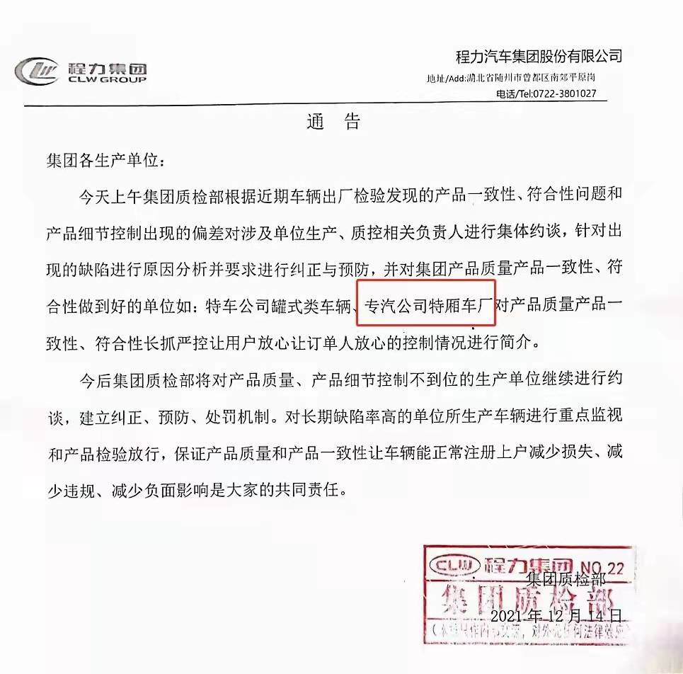 今后集團質檢部將對產品質量、產品細節和程力汽車亂象不一致性控制不到位的生產單位繼續進行約談,建立糾正、預防、處罰機制。對長期缺陷率高的單位所生產車輛進行重點監視和產品檢驗放行,保證產品質量和產品一致性讓車輛能正常注冊上戶減少損失、減少違規、減少負面影響是大家的共同責任。湖北程力內控品質,外樹形象!并且通告程力汽車各個生產車間嚴把生產質量關。為用戶提供更加完美產品和服務。