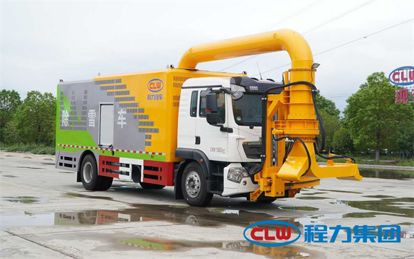 強力除雪車的工作原理:通過高壓風機作業,產生高壓、高速、高強冷風氣流清除地面的積雪、積水及其它粘附垃圾,具有低溫不傷路面、不損害路邊植物植被、無化學污染、作業能力強和使用、維護成本低等性能特點。