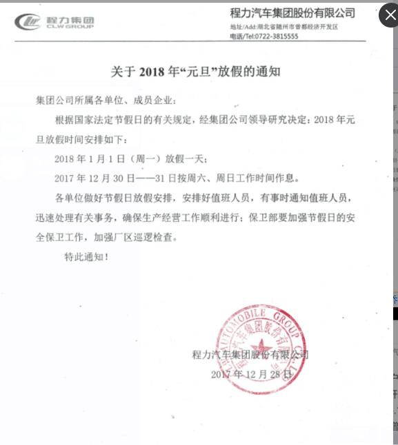 導讀:為了方便客戶購車,提前安排購車時間和計劃,湖北程力公司,先提前公布公司放假時間通知,元旦放假時間為:12月30,31,1號三天假期,與國家的法定節(jié)假日同步,如…