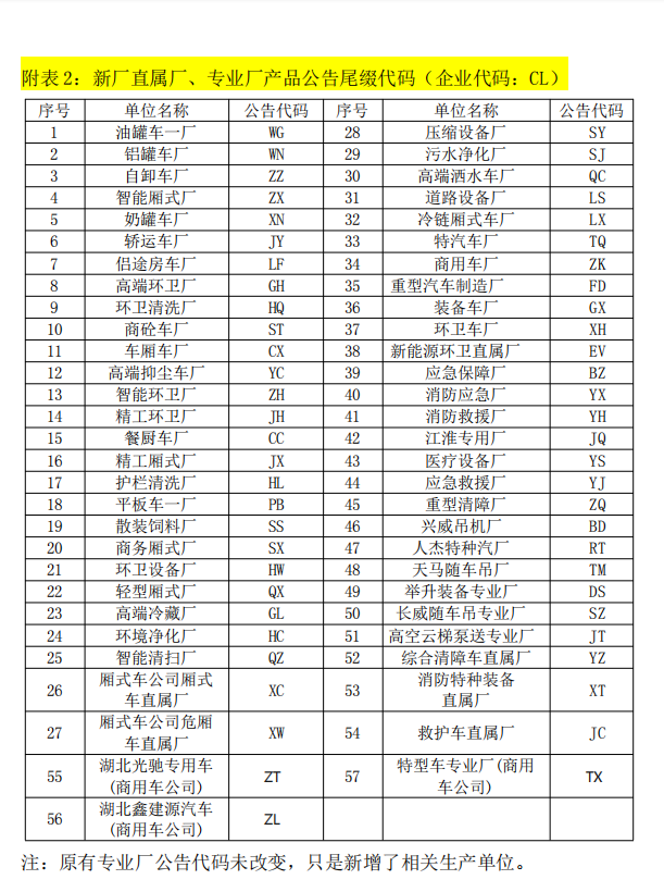 程力汽車集團(tuán)股份有限公司前身是湖北程力專用汽車有限公司,于2004年9月注冊(cè)成立,注冊(cè)資本10000萬(wàn)元,主要從事汽車整車、專用汽車、新能源汽車、汽車零部件和應(yīng)急裝備等研發(fā)、制造、銷售,以及金融、教育、服務(wù)、置業(yè)投資等業(yè)務(wù),連續(xù)多年榮膺中國(guó)民營(yíng)企業(yè)500強(qiáng)、湖北省民營(yíng)企業(yè)制造業(yè)100強(qiáng)。 湖北程力新廠直屬?gòu)S、專業(yè)廠產(chǎn)品公告尾綴代碼(企業(yè)代碼:CL)