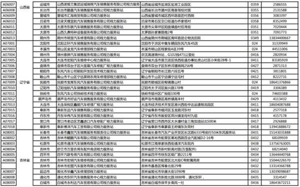 汽車山西省、遼寧省、吉林省服務站通訊錄: