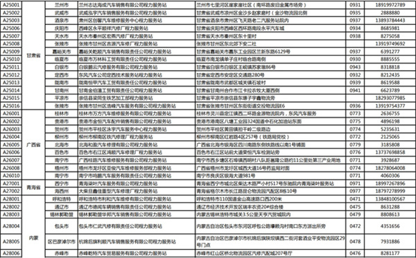 汽車甘肅省、廣西省、青海省、內蒙省服務站通訊錄: