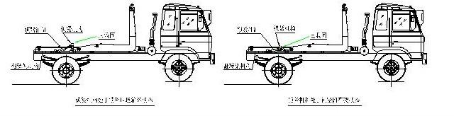 該車是由汽車底盤、拉臂主油缸、附車架、翻轉架、支撐腿(選裝)、鎖緊架、鎖緊油缸及多路換向閥等組成。翻轉架一端連在附車架上,其另一端設有活動拉臂,中間安裝有鎖緊系統;活動臂油缸一端連在活動臂上,另一端連接在附車架上;鎖緊機構通過鎖緊油缸的動作可以在箱體自卸時將附車架上的箱體與翻轉架及拉臂連為一體,在主油缸伸出時形成自卸角,也可以通過鎖緊油缸的收回把翻轉架與附車架鎖緊為一體,利用主油缸的收回或伸出使活動拉臂將地下的垃圾箱拖拉至附車架上或從附車架上放回到地面。