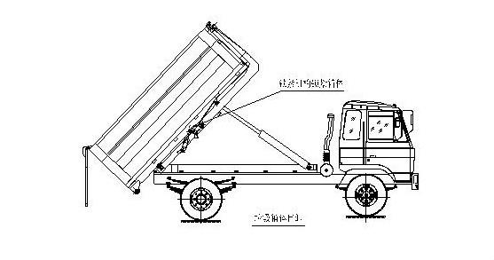 步驟5. 在卸垃圾前,整車運轉達到6個標準氣壓時掛上取力器,打開垃圾箱后門鎖緊裝置,在前級二聯多路閥處,首先確定鎖緊架鎖緊垃圾箱體(拉起鎖緊鉤操作手柄至鎖緊位置),然后拉起拉臂操作手柄至伸出位置,垃圾箱體備傾斜舉起垃圾卸出;如圖: