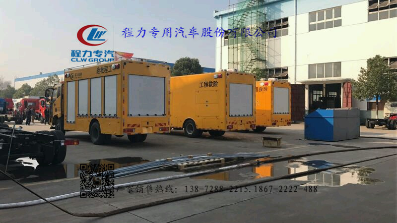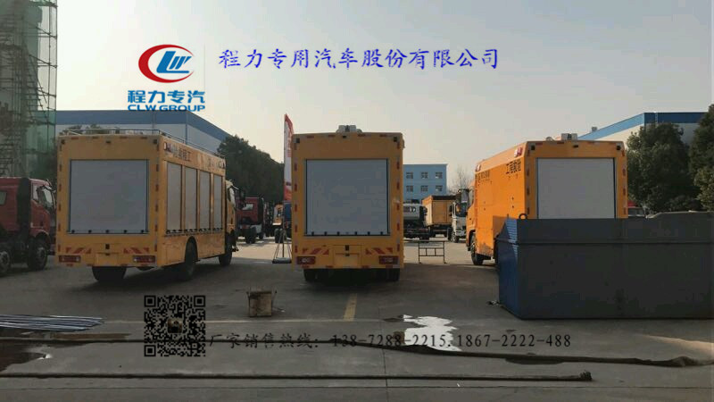 箱體:箱體外部鋼材為優(yōu)質冷軋鋼板,內襯優(yōu)質冷軋鋼板折彎骨架,工藝先進,強度牢固。箱體為全密封結構,具備運輸,防雨,防腐,防火,防銹要求。車廂尾部安裝鋁合金卷簾門,發(fā)電機組進排風消聲處理,消聲器做降噪處理,車廂水泵兩側設開門,發(fā)電機進分口和排風口防雨百葉窗,工作門下,尾部設有隱藏式抽拉梯,與車廂底板框架連接。