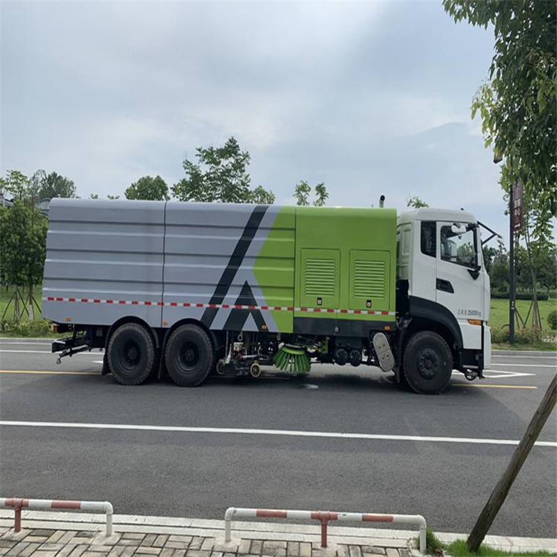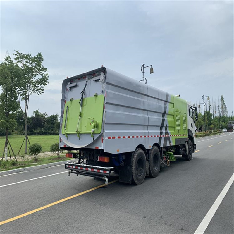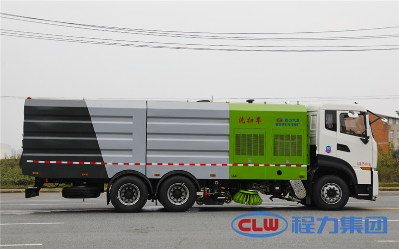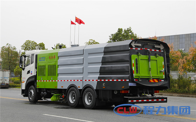 東風(fēng)天龍洗掃車副發(fā)動(dòng)機(jī)驅(qū)動(dòng)風(fēng)機(jī)和高壓水泵,副發(fā)動(dòng)機(jī)采用東風(fēng)康明期6缸柴油發(fā)動(dòng)機(jī)。 風(fēng)機(jī)用8.0高壓離心風(fēng)機(jī),效率高、風(fēng)量大,最高風(fēng)量達(dá)23500m3/h。 東風(fēng)天龍洗掃車高壓水泵采用同際知名T7012IR 型柱塞柱,流量合適,壓力高,允許最高壓力達(dá)10MPa,清水箱充分利用了車載空間,容積大,容積達(dá)12m3。 東風(fēng)天龍洗掃車?yán)洳捎脝螌硬讳P鋼結(jié)構(gòu),傾翻卸料,帶高壓位自潔裝置。自潔裝置可在垃圾箱卸料時(shí)幫助卸料,清洗垃圾箱內(nèi)部。 東風(fēng)天龍洗掃車左右立掃為單掃盤,減少了掃刷數(shù)量和掃刷消耗量,能降低使用成本。左右立掃分開控制,可實(shí)現(xiàn)左掃、右掃和全掃等不同作業(yè)模式。寬吸嘴的吸口寬度達(dá)到2418mm,確保作業(yè)總寬度大于3.5mm。 湖北程力國(guó)六東風(fēng)天龍后雙橋大型洗掃4個(gè)高度可調(diào)的吸嘴輪,能方面調(diào)整和保證吸嘴與路面間的合理間隙。吸嘴內(nèi)高有噴水桿,盡可能多地將高壓洗滌噴嘴布置在吸嘴內(nèi)部,不但清洗效果好,還能最大限度減少高壓水氣流沖起污物產(chǎn)生的二次污染。左右噴水桿安裝在吸嘴上,隨吸嘴升降,結(jié)構(gòu)簡(jiǎn)單緊湊,保證噴水桿的離地高度固定不變,達(dá)到最佳清洗效果。 東風(fēng)天龍洗掃車開式液壓系統(tǒng)驅(qū)動(dòng)左右立掃升降、左右掃肋旋轉(zhuǎn)、吸嘴升降、垃圾箱后門開閉、垃圾箱傾翻復(fù)位等機(jī)械動(dòng)作。底盤變速箱側(cè)取力器驅(qū)動(dòng)低壓水泵,實(shí)現(xiàn)灑水車的低壓沖洗功能。一鍵式作業(yè)起動(dòng)和停機(jī)操作。 東風(fēng)天龍大型洗掃車具有路面清洗、路面清掃、路緣清洗、路緣和路緣石立面洗刷、低壓沖洗、噴霧除塵等多功能。有“全洗掃”、 “左洗掃”、 “右洗掃”、 “全掃”、 “左掃”、 “右掃”6種作業(yè)模式可選擇。選擇“全洗掃”模式清洗廣場(chǎng)和路面,清洗效率高效果好,洗凈率達(dá)90%以上。選擇“左洗掃”或“右洗掃”模式清洗路面和路緣、洗刷路緣石立面。需要進(jìn)行路面清掃或路面保潔作業(yè)時(shí),可選擇掃路模式。需要噴霧除塵時(shí),可開啟噴霧裝置,進(jìn)行噴霧除塵作業(yè)。可以像灑水車一樣對(duì)路面進(jìn)行低壓沖洗作業(yè)。 東風(fēng)天龍大型洗掃車適用于城市道路、高速公路、廣場(chǎng)、機(jī)場(chǎng)、碼頭、遂道、橋梁、隔離墻避、路緣和路緣石立面的機(jī)械化清洗、清掃、噴霧降塵等清潔作業(yè)。
