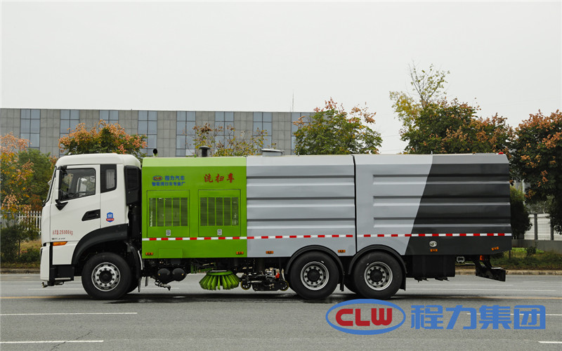 湖北程力國(guó)六東風(fēng)天龍后雙橋大型洗掃概述 洗掃車采用東風(fēng)天龍DFH1250D4 型國(guó)Ⅵ二類汽車底盤改裝,加裝副發(fā)動(dòng)機(jī)、風(fēng)機(jī)、高壓水泵、清水箱、垃圾箱、左右立掃、帶噴水桿的寬吸嘴、低壓沖洗系統(tǒng)、掃盤降塵系統(tǒng)、液壓系統(tǒng)、專用裝置電控系統(tǒng)和副車架等改裝而成。副發(fā)動(dòng)機(jī)驅(qū)動(dòng)風(fēng)機(jī)和高壓水泵,副發(fā)動(dòng)機(jī)采用東風(fēng)康明期6缸柴油發(fā)動(dòng)機(jī)。風(fēng)機(jī)用7.1高壓離心風(fēng)機(jī),效率高、風(fēng)量大,最高風(fēng)量達(dá)23500m3/h。高壓水泵采用同際知名GTM 型柱塞柱,流量合適,壓力高,允許最高壓力達(dá)10MPa,清水箱充分利用了車載空間,容積大,容積達(dá)12m3。垃圾箱采用單層不銹鋼結(jié)構(gòu),傾翻卸料,帶高壓位自潔裝置。自潔裝置可在垃圾箱卸料時(shí)幫助卸料,清洗垃圾箱內(nèi)部。左右立掃為單掃盤,減少了掃刷數(shù)量和掃刷消耗量,能降低使用成本。左右立掃分開控制,可實(shí)現(xiàn)左掃、右掃和全掃等不同作業(yè)模式。寬吸嘴的吸口寬度達(dá)到2418mm,確保作業(yè)總寬度大于3.5mm。4個(gè)高度可調(diào)的吸嘴輪,能方面調(diào)整和保證吸嘴與路面間的合理間隙。吸嘴內(nèi)高有噴水桿,盡可能多地將高壓洗滌噴嘴布置在吸嘴內(nèi)部,不但清洗效果好,還能最大限度減少高壓水氣流沖起污物產(chǎn)生的二次污染。左右噴水桿安裝在吸嘴上,隨吸嘴升降,結(jié)構(gòu)簡(jiǎn)單緊湊,保證噴水桿的離地高度固定不變,達(dá)到最佳清洗效果。開式液壓系統(tǒng)驅(qū)動(dòng)左右立掃升降、左右掃肋旋轉(zhuǎn)、吸嘴升降、垃圾箱后門開閉、垃圾箱傾翻復(fù)位等機(jī)械動(dòng)作。底盤變速箱側(cè)取力器驅(qū)動(dòng)低壓水泵,實(shí)現(xiàn)灑水車的低壓沖洗功能。一鍵式作業(yè)起動(dòng)和停機(jī)操作。 CLW5250TXSD6型洗掃車具有路面清洗、路面清掃、路緣清洗、路緣和路緣石立面洗刷、低壓沖洗、噴霧除塵等多功能。有“全洗掃”、 “左洗掃”、 “右洗掃”、 “全掃”、 “左掃”、 “右掃”6種作業(yè)模式可選擇。選擇“全洗掃”模式清洗廣場(chǎng)和路面,清洗效率高效果好,洗凈率達(dá)90%以上。選擇“左洗掃”或“右洗掃”模式清洗路面和路緣、洗刷路緣石立面。需要進(jìn)行路面清掃或路面保潔作業(yè)時(shí),可選擇掃路模式。需要噴霧除塵時(shí),可開啟噴霧裝置,進(jìn)行噴霧除塵作業(yè)。可以像灑水車一樣對(duì)路面進(jìn)行低壓沖洗作業(yè)。 CLW5250TXSD5型洗掃車適用于城市道路、高速公路、廣場(chǎng)、機(jī)場(chǎng)、碼頭、遂道、橋梁、隔離墻避、路緣和路緣石立面的機(jī)械化清洗、清掃、噴霧降塵等清潔作業(yè)。 湖北程力國(guó)六東風(fēng)天龍后雙橋大型洗掃表1整車性能與結(jié)構(gòu)參數(shù)表