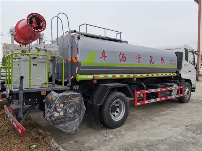 東風天錦12噸30米霧炮車亮點: 底盤配置:采用原裝東風天錦底盤,軸距4700或者5000,國六康明斯210馬力發動機,東風6檔變速箱,900R20鋼絲胎帶備胎,氣剎,斷氣剎,方向助力,離合助力,原裝空調,電動玻璃,中控鎖,東風原廠4通道ABS。改裝配置:采用4mm國標碳鋼板縱縫焊接一次卷制成型,罐內設防浪隔板防止水浪沖擊,有效容積12-14立方可選,配60/90大功率灑水泵,管道采用大口徑無縫鋼管+大口徑球閥,標配14米前沖,后灑側噴功能,35米平臺水炮,后平臺加裝30米霧炮機及8.5KW柴油專用副發電機。 霧炮機參數:射程30米,風機電機3KW,水泵電機3KW,噴霧流量20L/min,工作壓力1.5-3.5MPa,霧粒度50-150微米,360°水平旋轉,-10~45°上下俯仰角度,手動+遙控控制,霧炮機尺寸:1300*700*1600mm 湖北程力國六東風天錦12方-14方綠化噴灑車|霧炮抑塵車|灑水車程力威牌CLW5161GPS6WL型綠化噴灑車CLW5180GPSE6型綠化噴灑車圖片價格:
